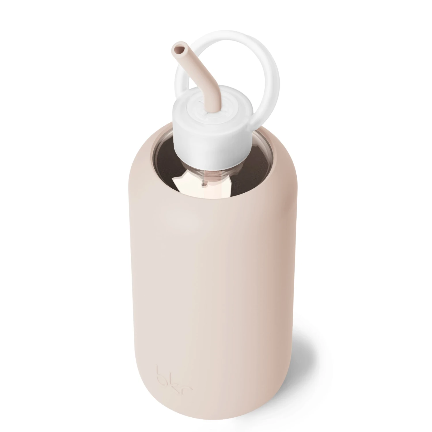 This size is called the Big. The mother of all reusable glass water bottles, this oversized beauty is the most serious hydration of your life and will help get that hydrated glow back into your cheeks. Not little, not light, but with a pretty and protective smooth silicone sleeve. This 1L (32 oz) water bottle is exactly right for yoga, working out, on your bedside table and at your desk.Â