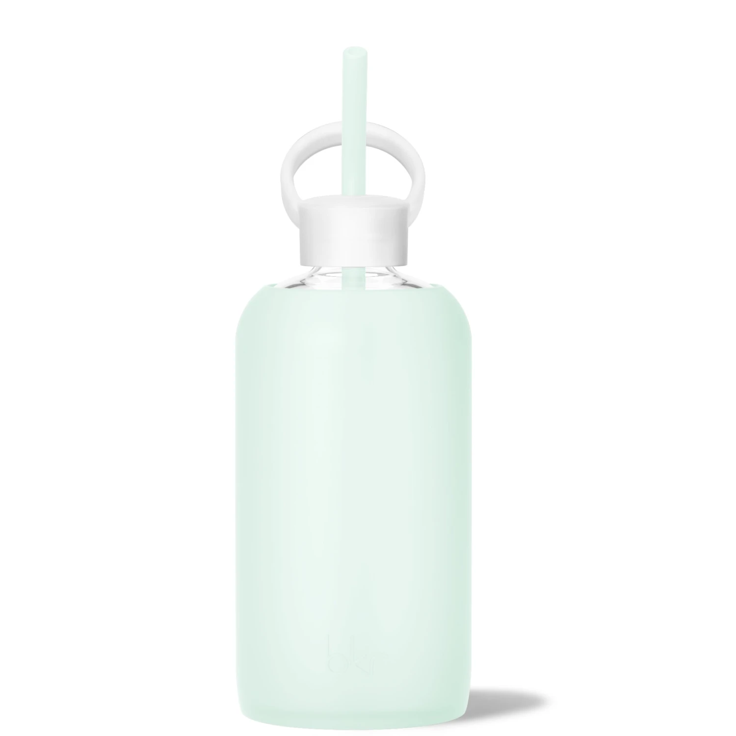 This size is called the Big. The mother of all reusable glass water bottles, this oversized beauty is the most serious hydration of your life and will help get that hydrated glow back into your cheeks. Not little, not light, but with a pretty and protective smooth silicone sleeve. This 1L (32 oz) water bottle is exactly right for yoga, working out, on your bedside table and at your desk.Â