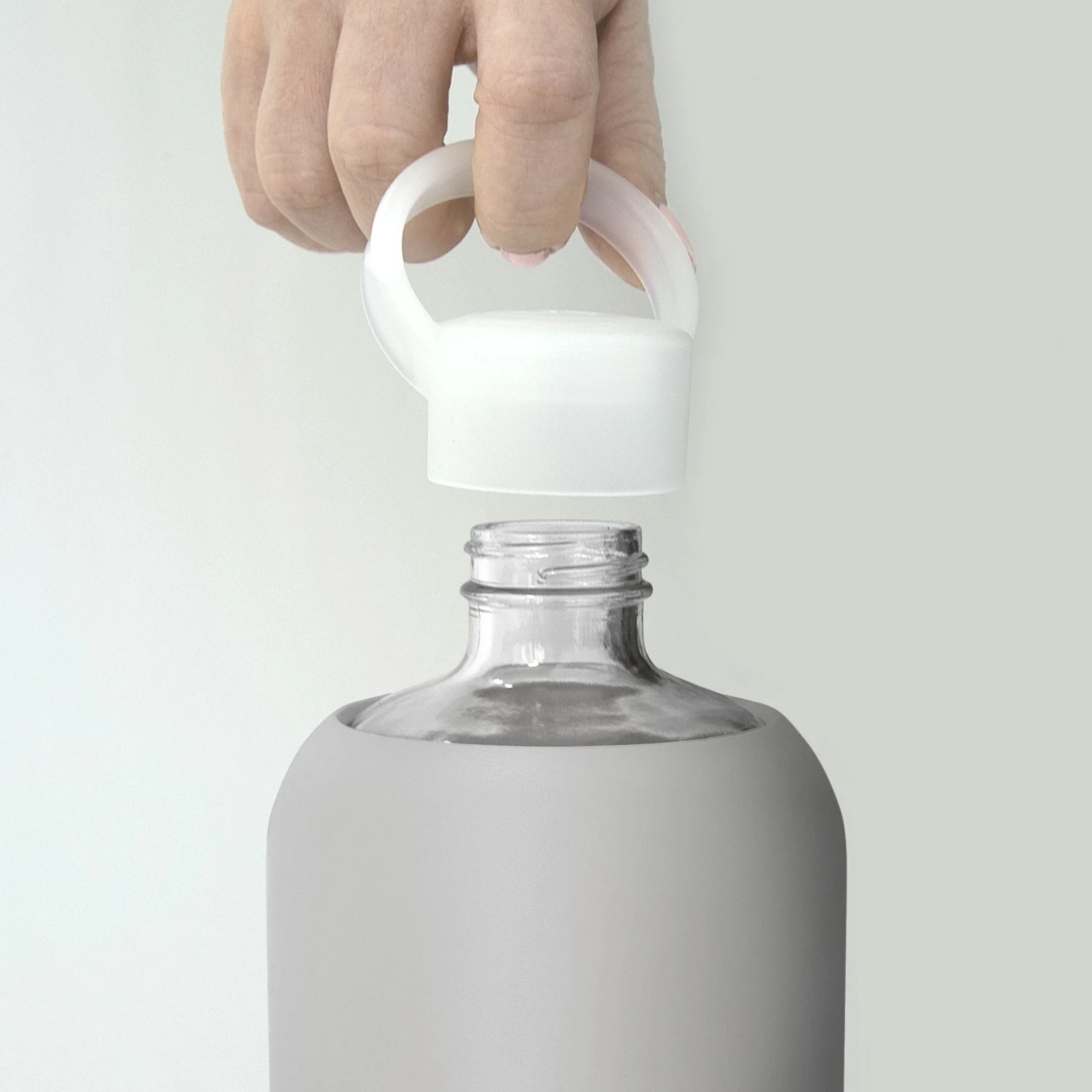 This size is called the Big. The mother of all reusable glass water bottles, this oversized beauty is the most serious hydration of your life and will help get that hydrated glow back into your cheeks. Not little, not light, but with a pretty and protective smooth silicone sleeve. This 1L (32 oz) water bottle is exactly right for yoga, working out, on your bedside table and at your desk.Â