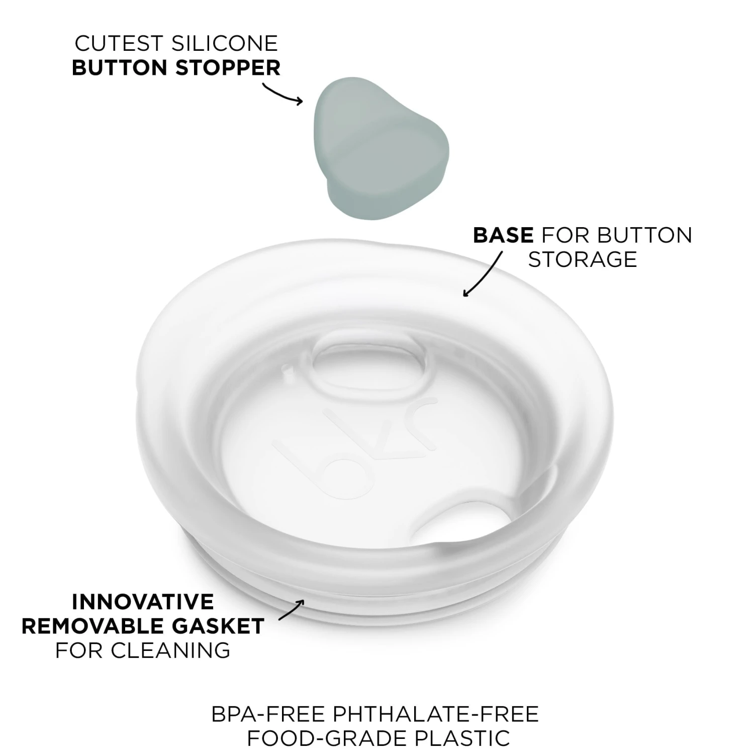– Splash resistant. Pop and lock the removable silicone bkr button from its base on the cap into the opening to help prevent splashback as you run around town