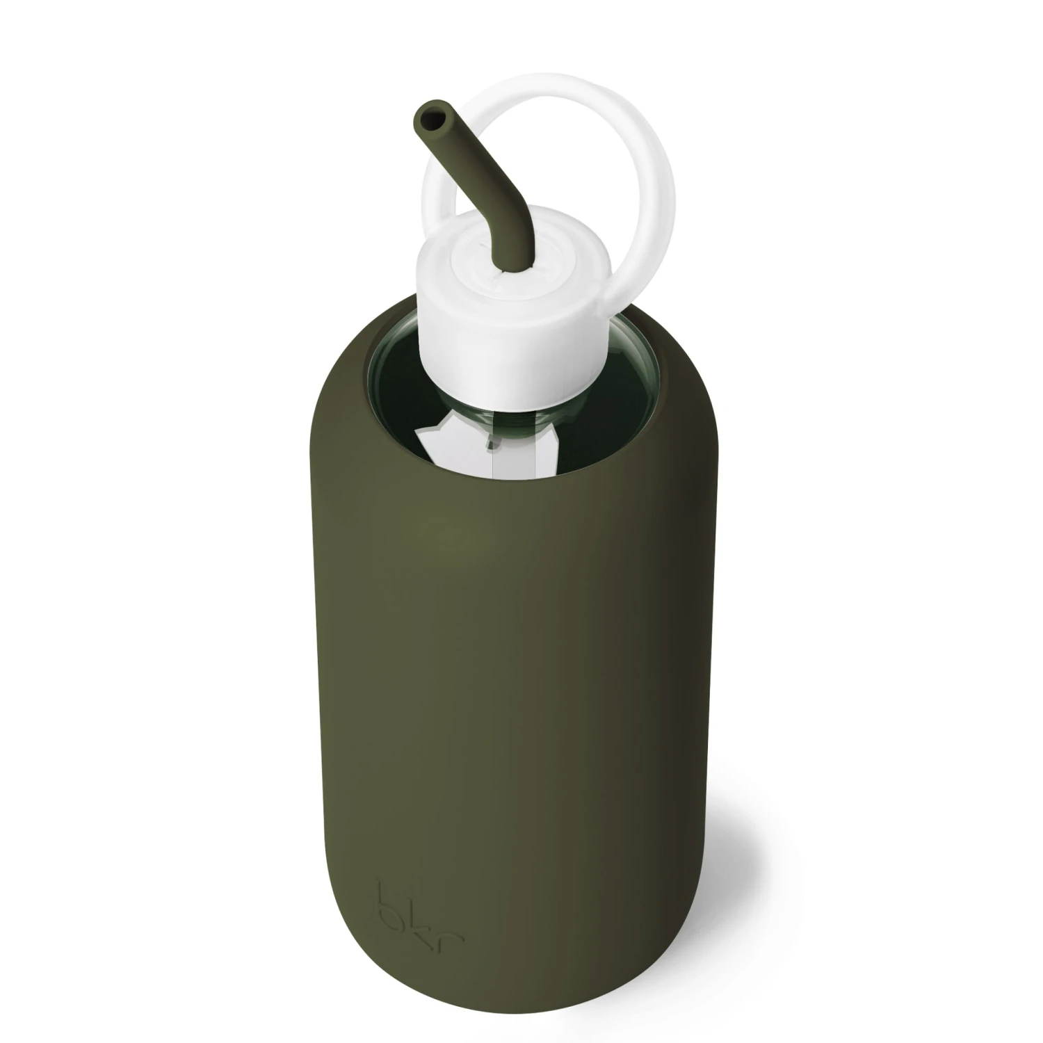 This size is called the Big. The mother of all reusable glass water bottles, this oversized beauty is the most serious hydration of your life and will help get that hydrated glow back into your cheeks. Not little, not light, but with a pretty and protective smooth silicone sleeve. This 1L (32 oz) water bottle is exactly right for yoga, working out, on your bedside table and at your desk.Â