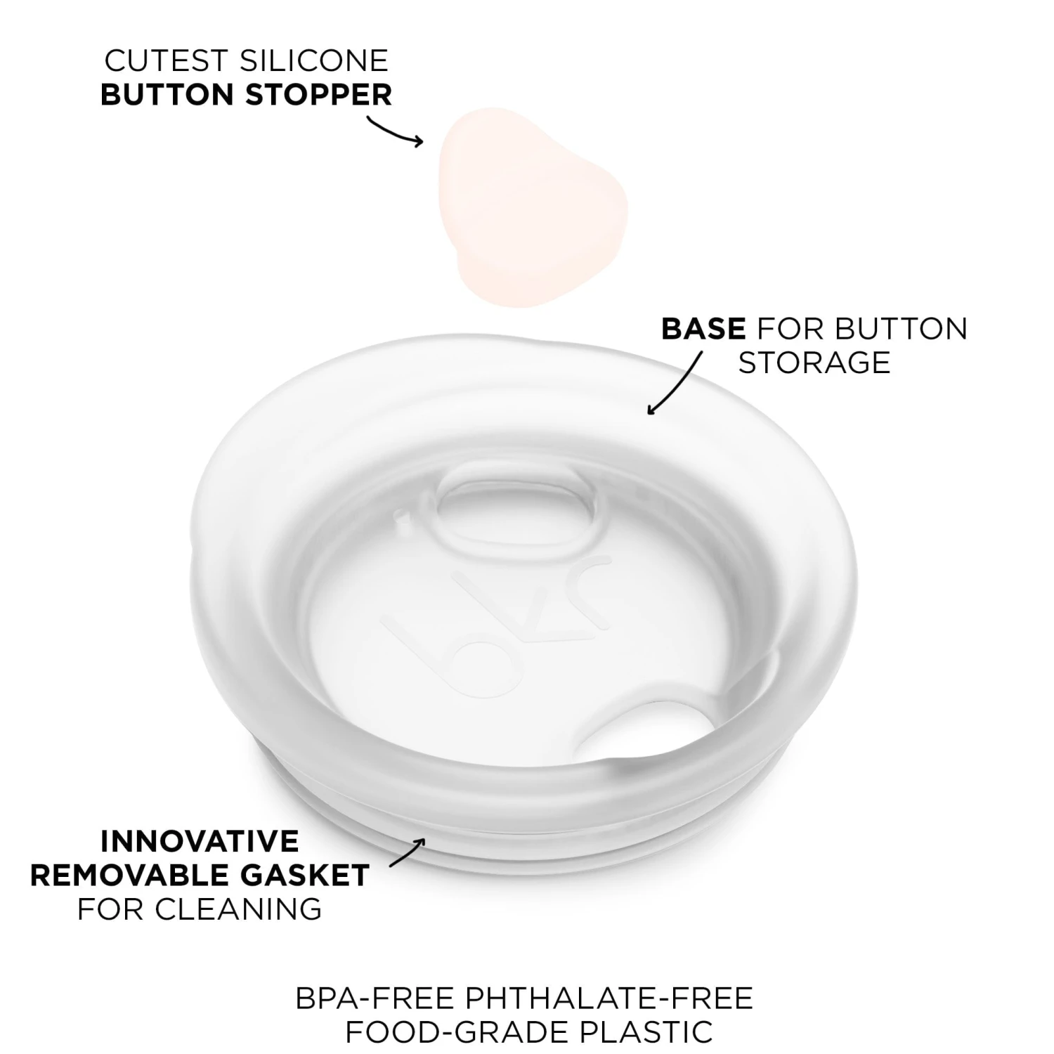– Splash resistant. Pop and lock the removable silicone bkr button from its base on the cap into the opening to help prevent splashback as you run around town
